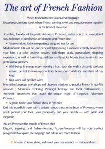 Clôturez cette aventure avec un défilé unique au cœur de la Provence, où vous présenterez votre look, votre personnalité et vos progrès en français — un moment de fierté, d’élégance et d’émotion.