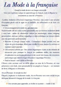 Vivez une expérience unique où apprentissage du français, style et élégance se rencontre au cœur de la Provence